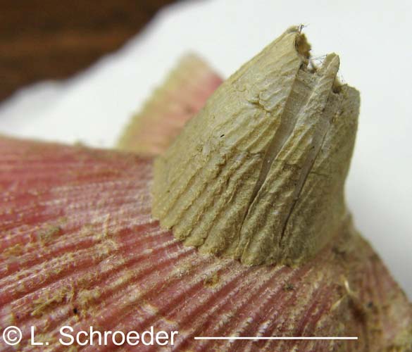 rostrum is two flattened leaf-like horns with rounded outside edges