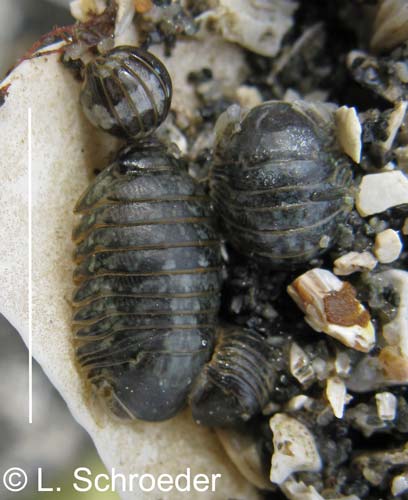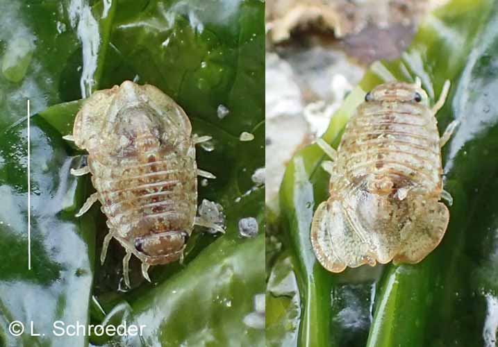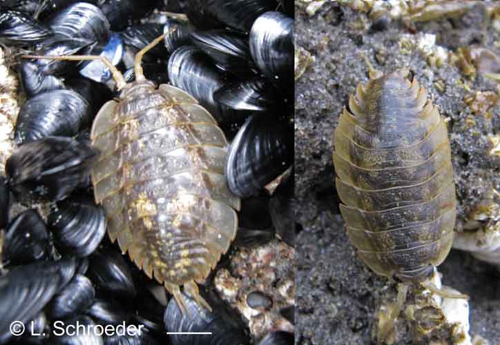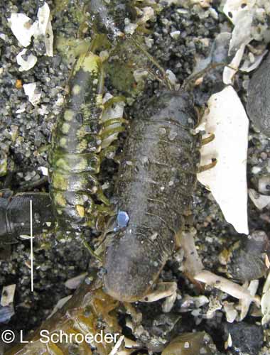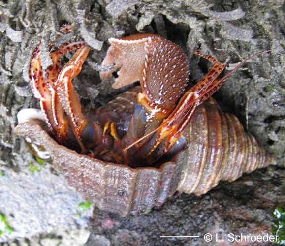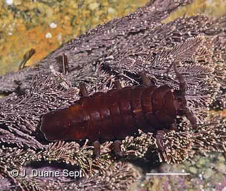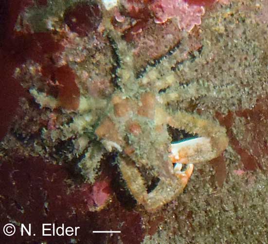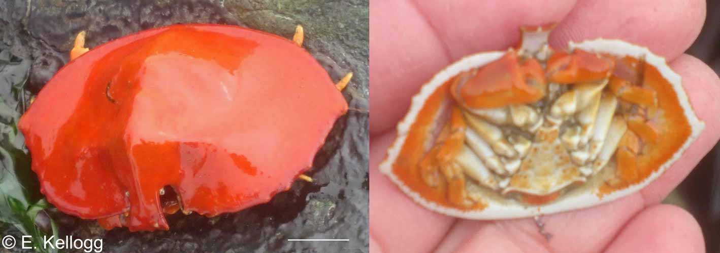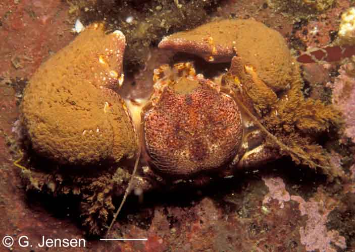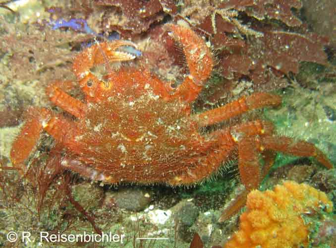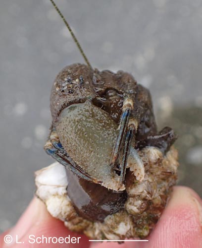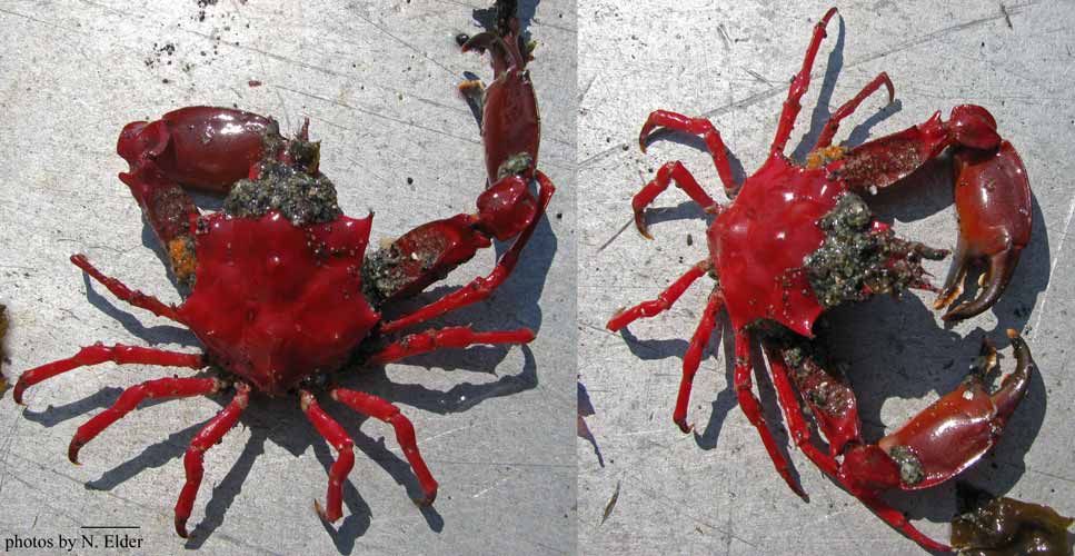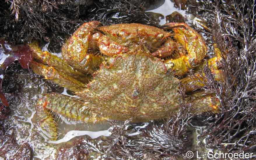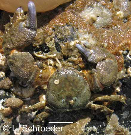 Very rarely intertidal, greenish-gray to reddish, carapace and legs covered in scale-like plates