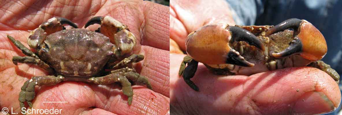 Light to dark brown color, carpus of claw very broad, high to mid intertidal on or near the outer coast