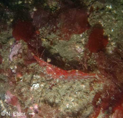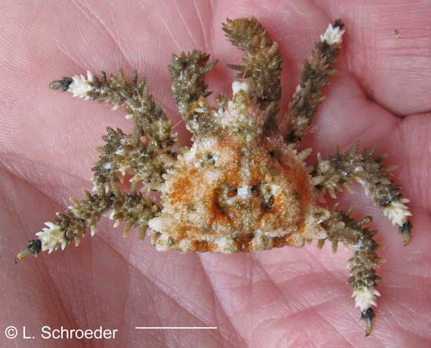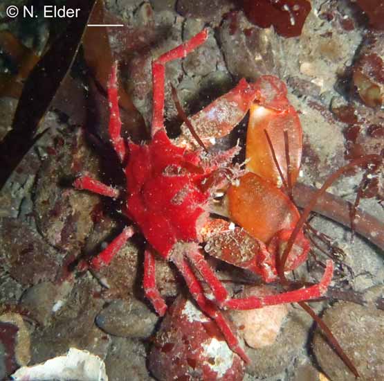 Usually red but juveniles variable from white to red, may decorate with a single piece of seaweed on its long rostrum