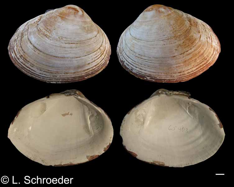 thicker than Serripes groenlandicus and more elongate.  The periostracum is dull
