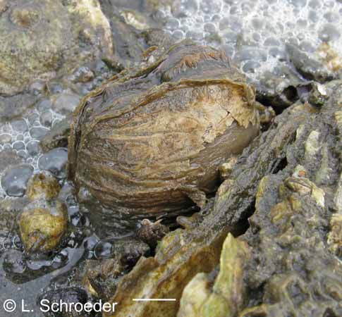 This is occasionally found intertidally in its southern range and commonly found to the north.  It prefers a muddy location.  The periostracum is dark, shiny, and rough, and tends to be worn away near the hinged end of the shell.