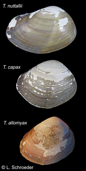 This is commonly found and one can see its exposed siphons at low tide.  It is more elongated than T. capax and also lives buried up to 20 inches deep.  The small projections inside the incurrent siphon tend to be dark green on the T. nuttallii and gold on the T. capax. This species never hosts pea crabs.