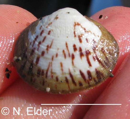 It can be found intertidally at good low tides.  It has a chalky white shell with brown flecks and maculations.  There are numerous teeth on the