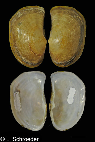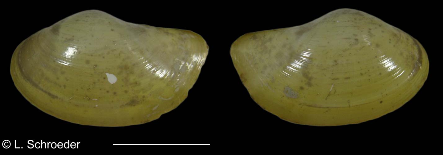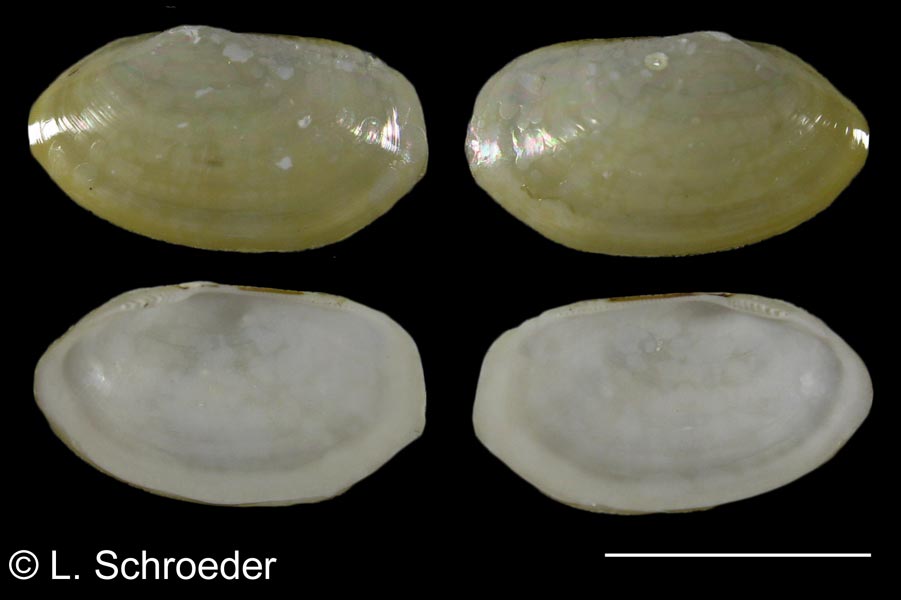 It has an elongated, thin shell. The periostracum is adherent and shiny yellow to dark brown.