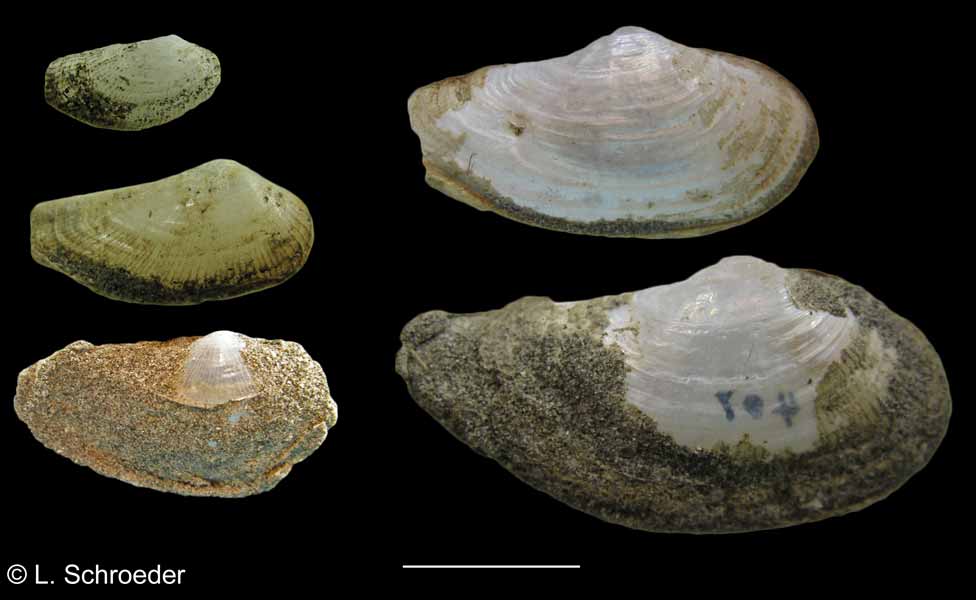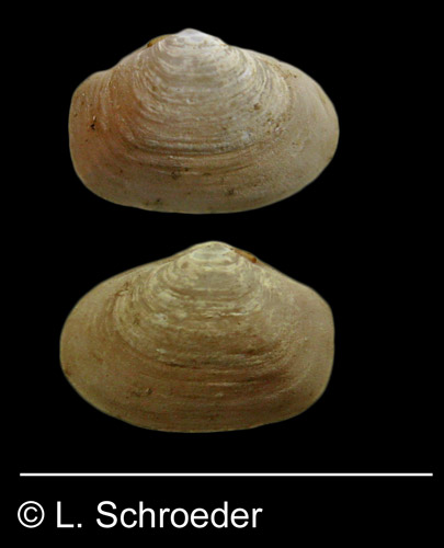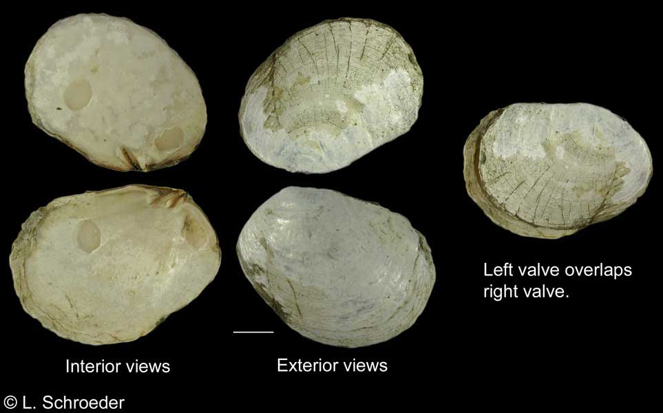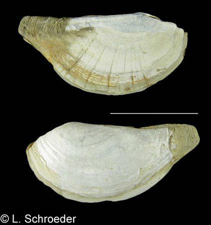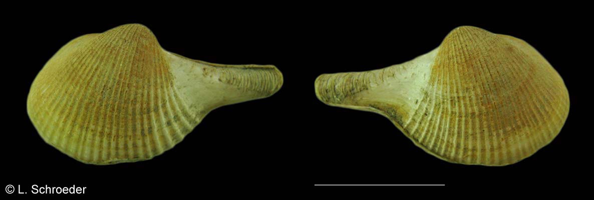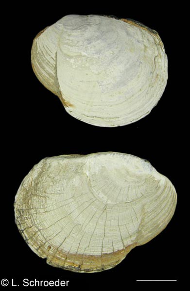In this rare shell the right valve is more inflated than the left. It also has a granular surface.