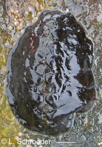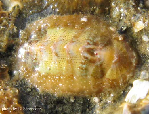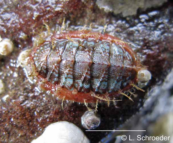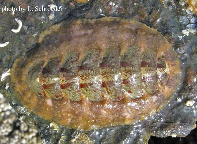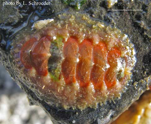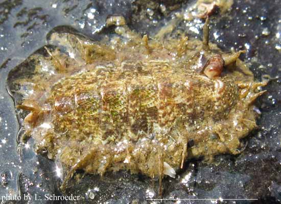 This is infrequently found intertidally.  The plates are usually dark in color but may be streaked with other colors.  The girdle is longer on the head end.  This omnivore grazes algae and also traps prey under its veil.
