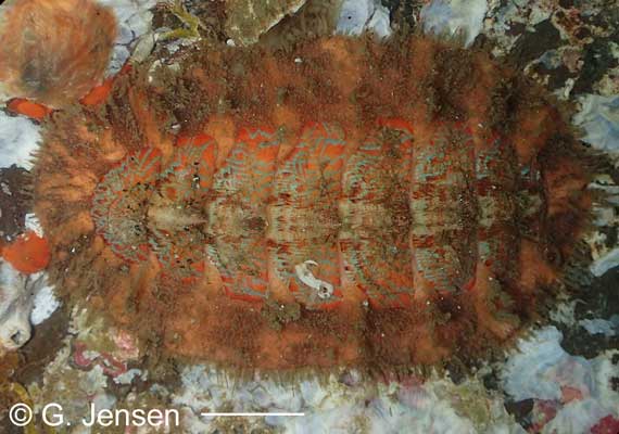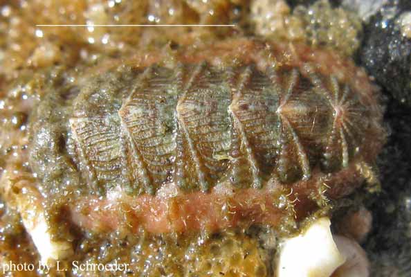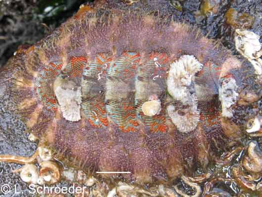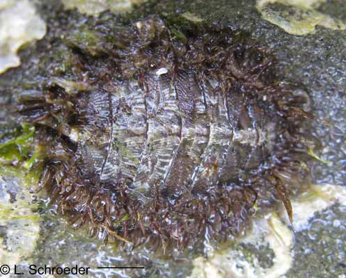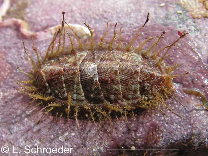 This species is infrequently found intertidally in the Northwest.  It is usually pale brown to dark grayish-brown with some red or white markings.  The plates have very defined sculpture with beaded ridges. The hairs are slender and usually curved with numerous branching bristles which stick out from the hair.