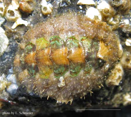 This is a very common species.  It is highly variable in color and almost always has the distinctive rays of lines running the length of the chiton.  The plates nearly smooth.  The hairs are unbranched and usually curved.