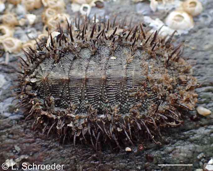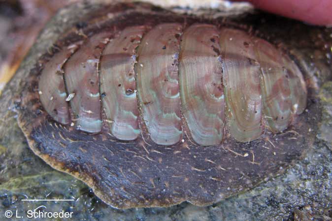 This species is found in outer coastal habitat and is predominantly subtidal.  In its northern range it can occasionally be found on a very good low tide.  The plates may be variably colored and patterned.  The short bristles (about 2mm) have no groove and are branched with 5 rows of irregular spicules. The spicules can also be sparse.