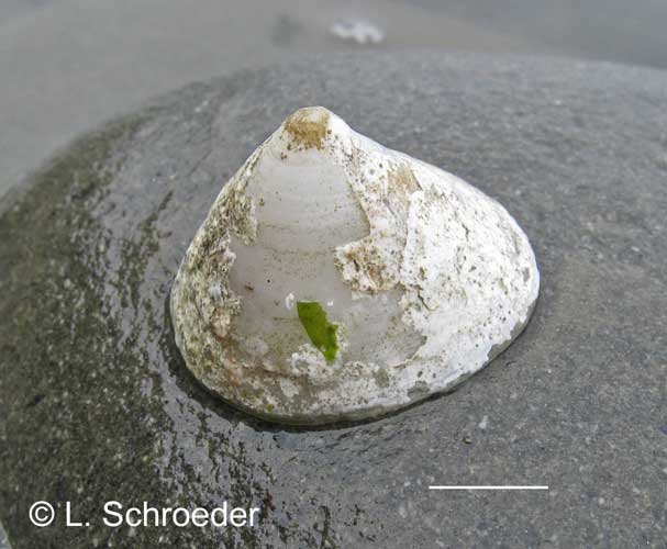 is infrequently found intertidally on the lowest tides. It is a white shell