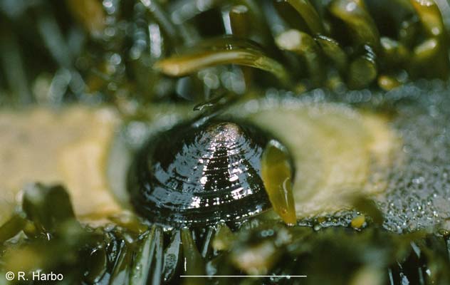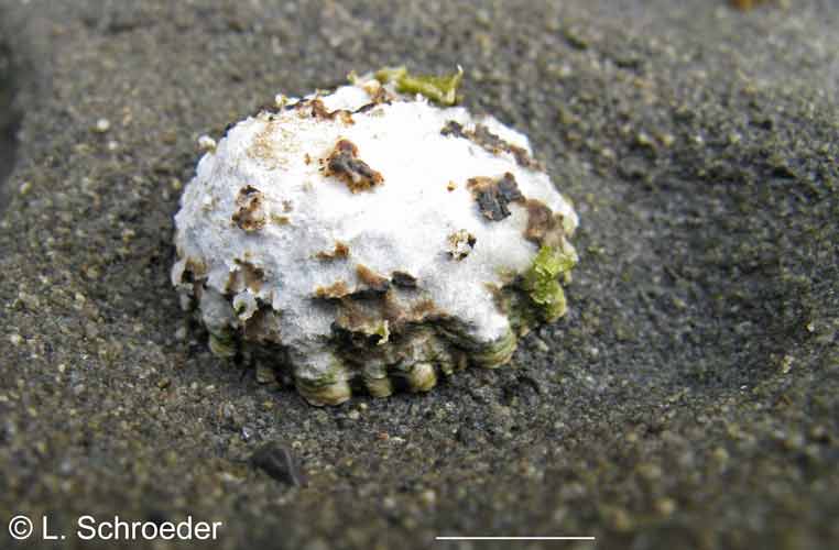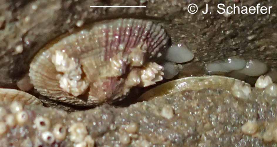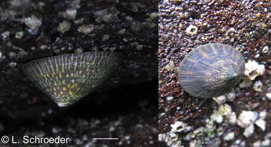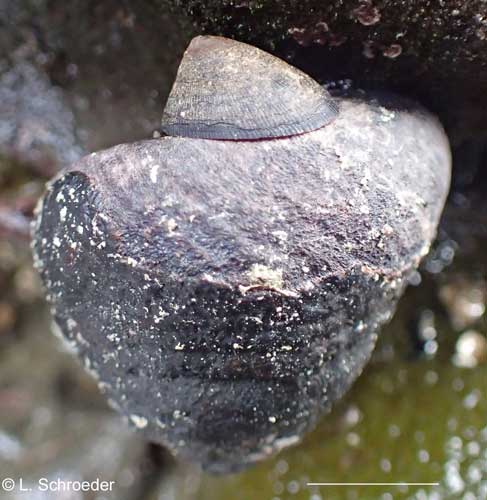 This is commonly found in the higher intertidal zone. It lives among the barnacles. The apex is far forward