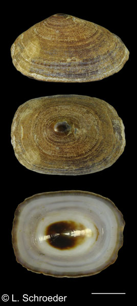 show faint radial ribs, but these become obscured on older specimens. The shell also becomes significantly