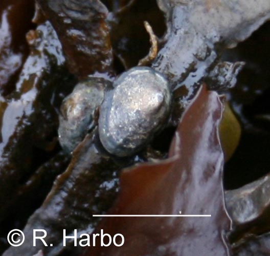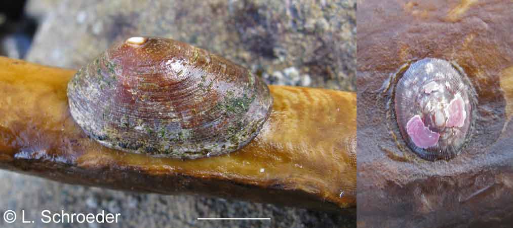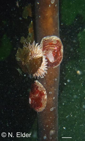 form is shown here and it is often white and encrusted with coralline algae. A more compressed, wider form lives on the stipes of