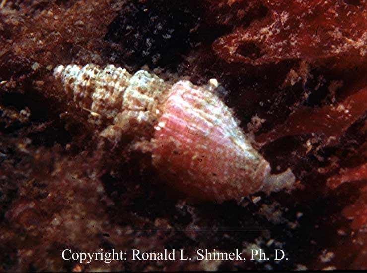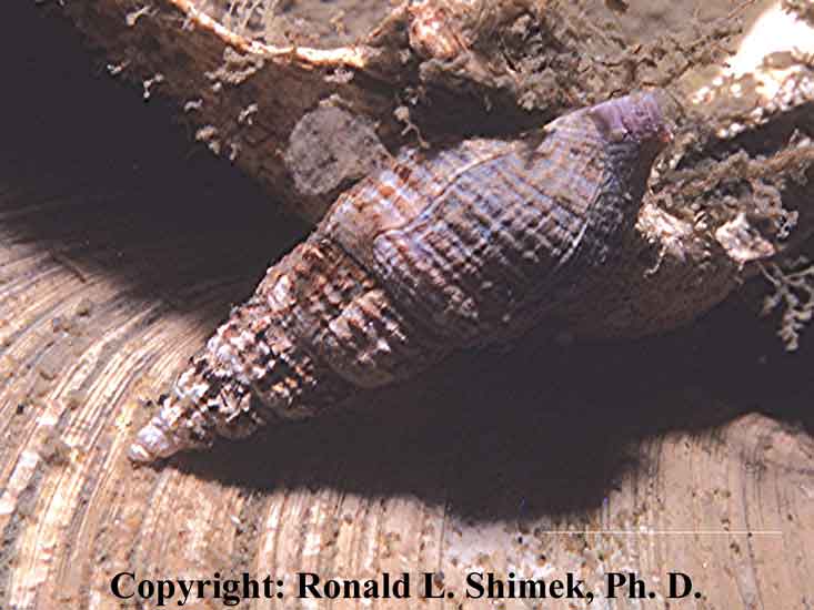 This shell has axial ribs, spiral ridges and squared shoulders. The snail lives on or near rocks.