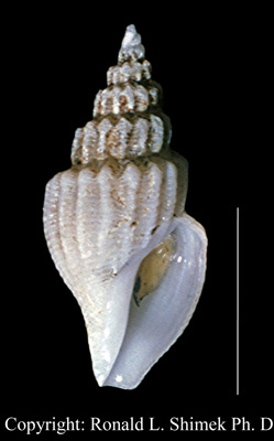 This shell has axial ribs, closely spaced spiral ridges and distinct shoulders.