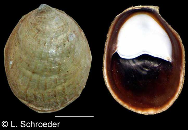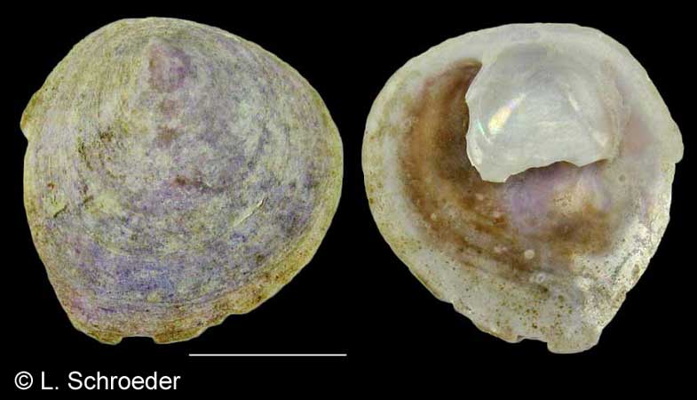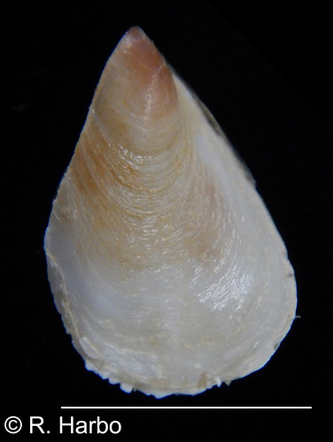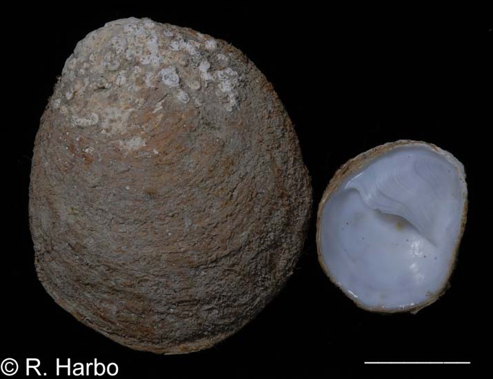 is somewhat wrinkled with a thin periostracum. Tan to mauve