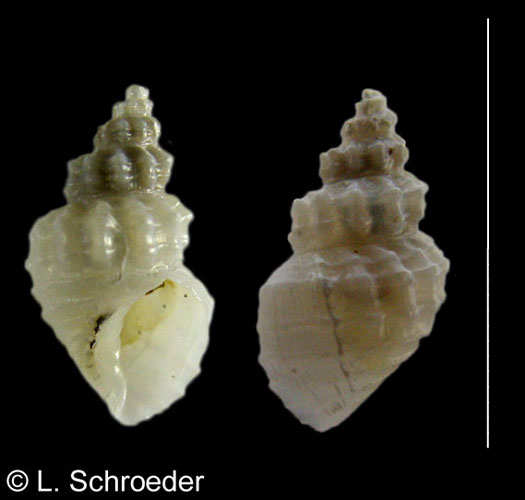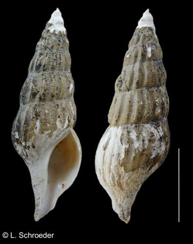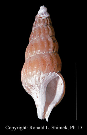 This is a long, narrow shell with a long siphonal canal. It has axial ribbing and faint spiral grooves.