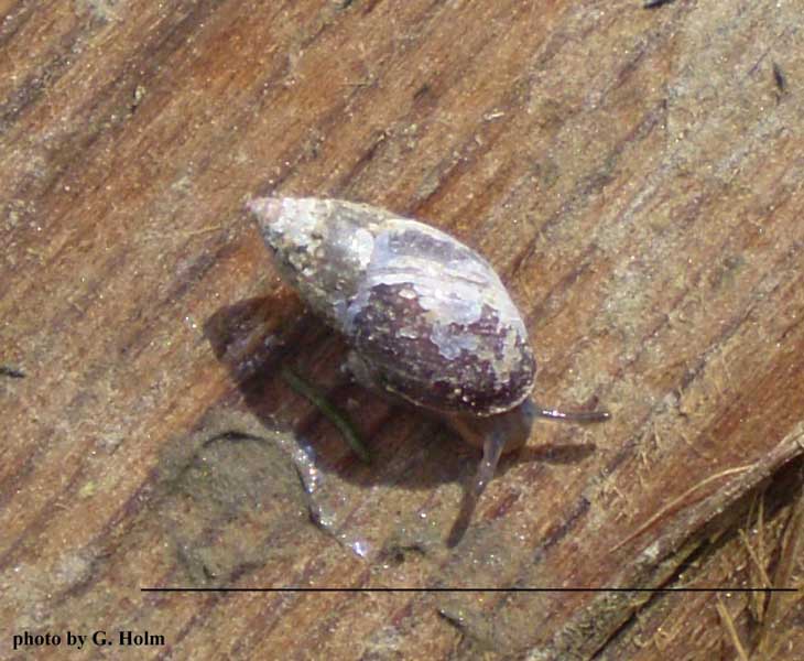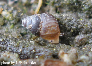 Lives in salt marshes, introduced & invasive; has been found in several estuaries in Oregon; distinguish from A. californica by the light colored band at the top of each whorl