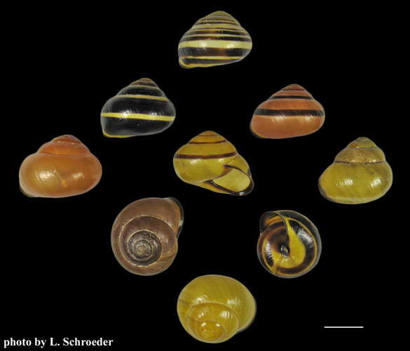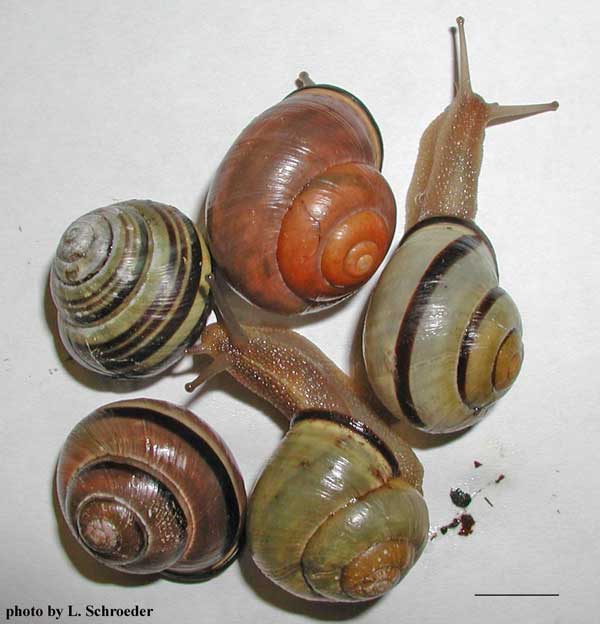 it should be reported to the appropriate State Wildlife Dept. The Cepaea is similar in size to the Cernuella and both may be banded, but Cepaea does not have an open umbilicus (hole on the bottom). The Cernuella and Candidula look very much alike but the Candidula does not get as big as Cernuella.